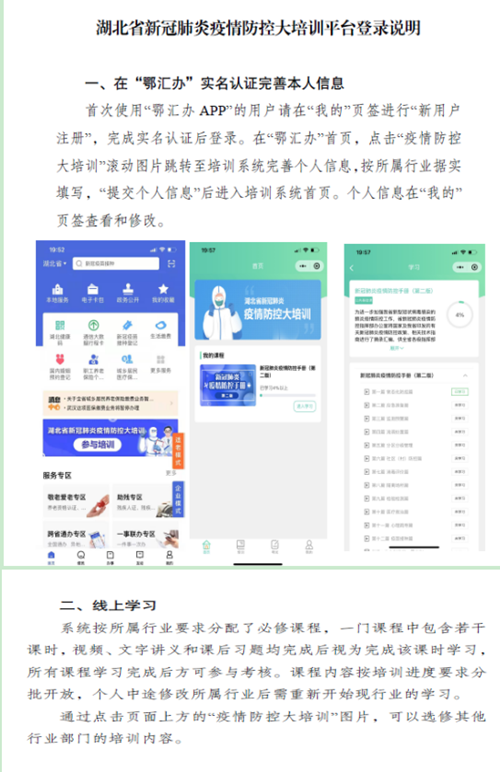 各级疫情防控机构和专兼职人员需下载“鄂汇办APP”,完成“新用户注册”,实名认证后登录。在“鄂汇办”登录入口,点击“疫情防控大培训”滚动图片跳转至培训系统完善个人信息,根据自己所属行业据实填写,系统按照不同行业需求自动分配必修课程,一门课程中包含若干课时,视频、文字讲义和课后习题均完成后视为完成该课时学习,所有课程学习完成后方可参与考核。经线上考核合格的参训人员可获得培训合格证明。