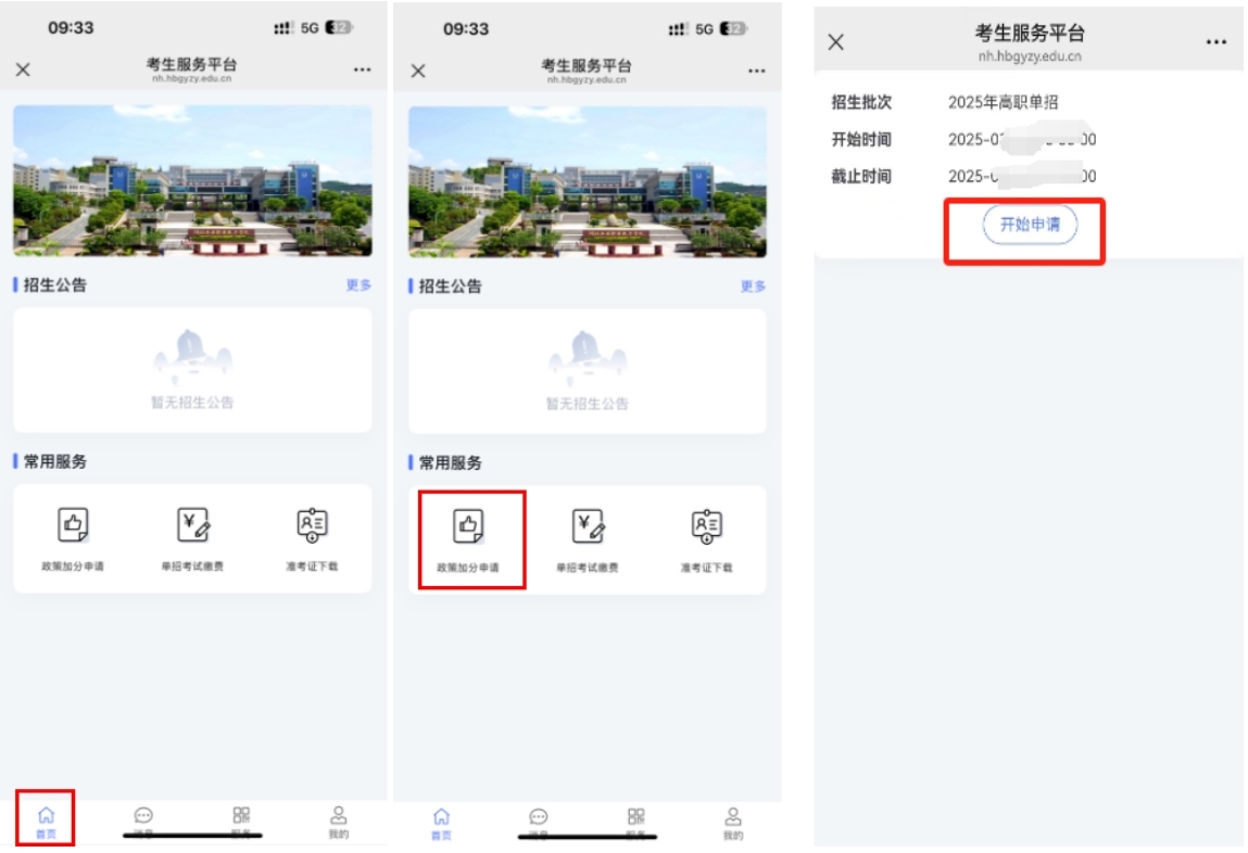 请各位考生于2025年3月28日至3月29日期间登陆考生服务平台(http://nh.hbgyzy.edu.cn/zs_mobile/index.html#/)按要求依次完成注册登录、单招政策性加分材料上传、考试缴费、签订考生承诺书及准考证下载打印。无符合加分条件政策材料的考生可以跳过此项操作。详细操作流程见附件操作手册。