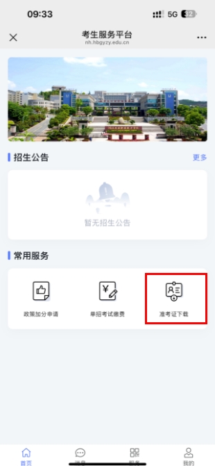 6.1点击"登录入口"按钮回到主页,在"常用服务"里点击"准考证下载",进入准考证页面,如下图所示: